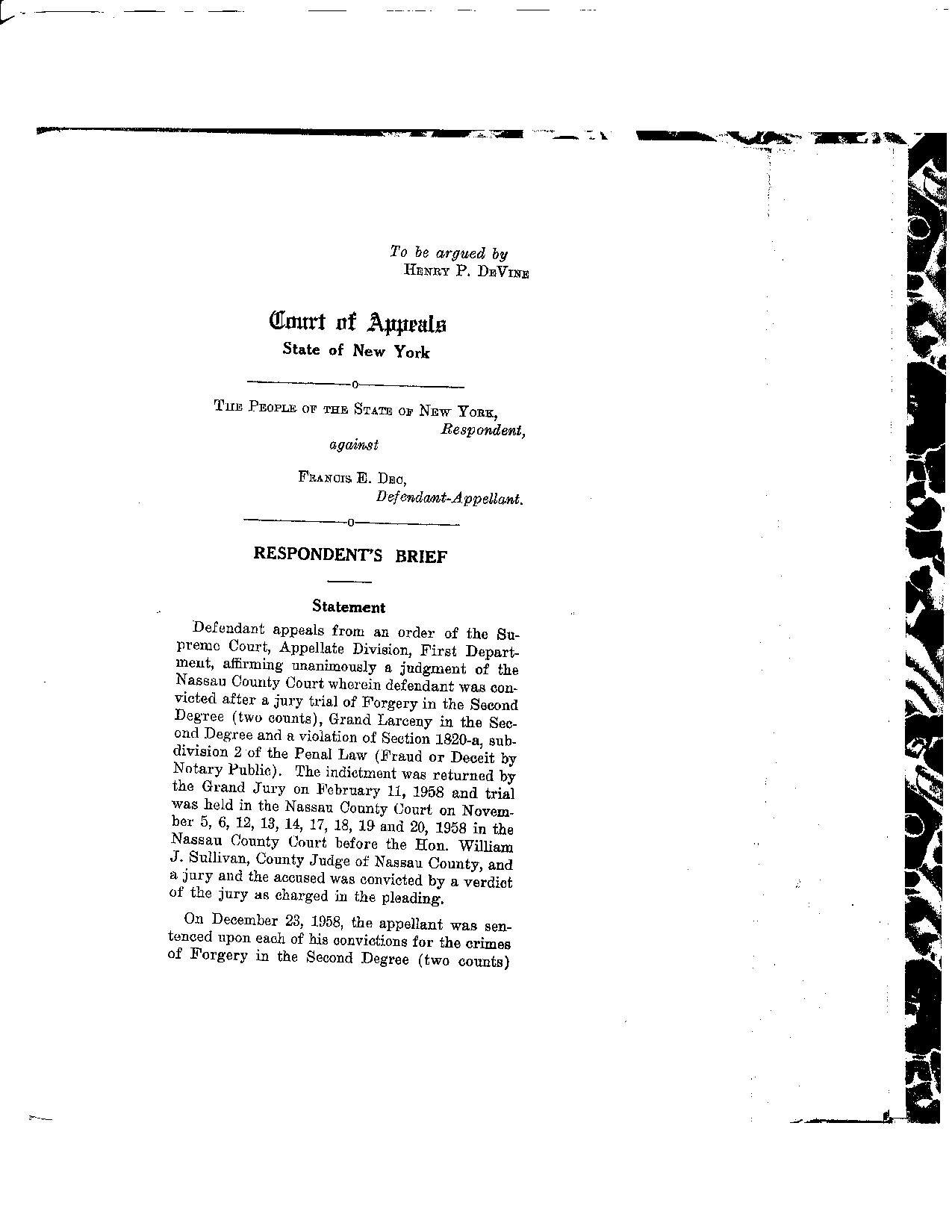 To be argued by Henry P. DeVine State of New York The People of the State of New York, Respondent, against Francis E. Dec, Defendant-Appellant. - - - - - - - - - - - - - - - - - - - - - - - - - - - Defendant appeals from an order of the Supreme Court, Appellate Division, First Department, affirming unanimously a judgment of the Nassau County Court wherein defendant was convicted after a jury trial of Forgery in the Second Degree (two counts), Grand Larceny in the Second Degree and a violation of Section 1820-a, subdivision 2 of the Penal Law (Fraud or Deceit by Notary Public). The indictment was returned by the Grand Jury on February 11, 1958 and trial was held in the Nassau County Court on November 5, 6, 12, 13, 14, 17, 18, 19, and 20, 1958 in the Nassau County Court before the Hon. William J. Sullivan, County Judge of Nassau County, and a jury and the accused was convicted by a verdict of the jury as charged in the pleading. On December 23, 1958, the appellant was sentenced upon each of his convictions for the crimes of Forgery in the Second Degree (two counts) and Grand Larceny in the Second Degree to Sing Sing Prison to indeterminate terms, the maximum of each term being five years and the minimum two and one-half years, which the direction that such sentences were to run concurrently. Execution of each of these sentences was suspended and the apellant was placed upon probation for the maximum period allowed by law. Upon his conviction for the crime of violation of Section 1820-a, subdivision 2, of the Penal Law (Fraud or Deciet by Notary Public) The Apellant recieved a suspended sentence. Leave to appeal to the Court of Appeals was granted by Hon. Adrian P. Burke of this Court by certificate dated February 17, 1961 and a notice of appeal, dated February 27, 1961 was served and filed. This Court granted permission to appeal on the original record and typewritten briefs on or about April 20, 1961. Upon the