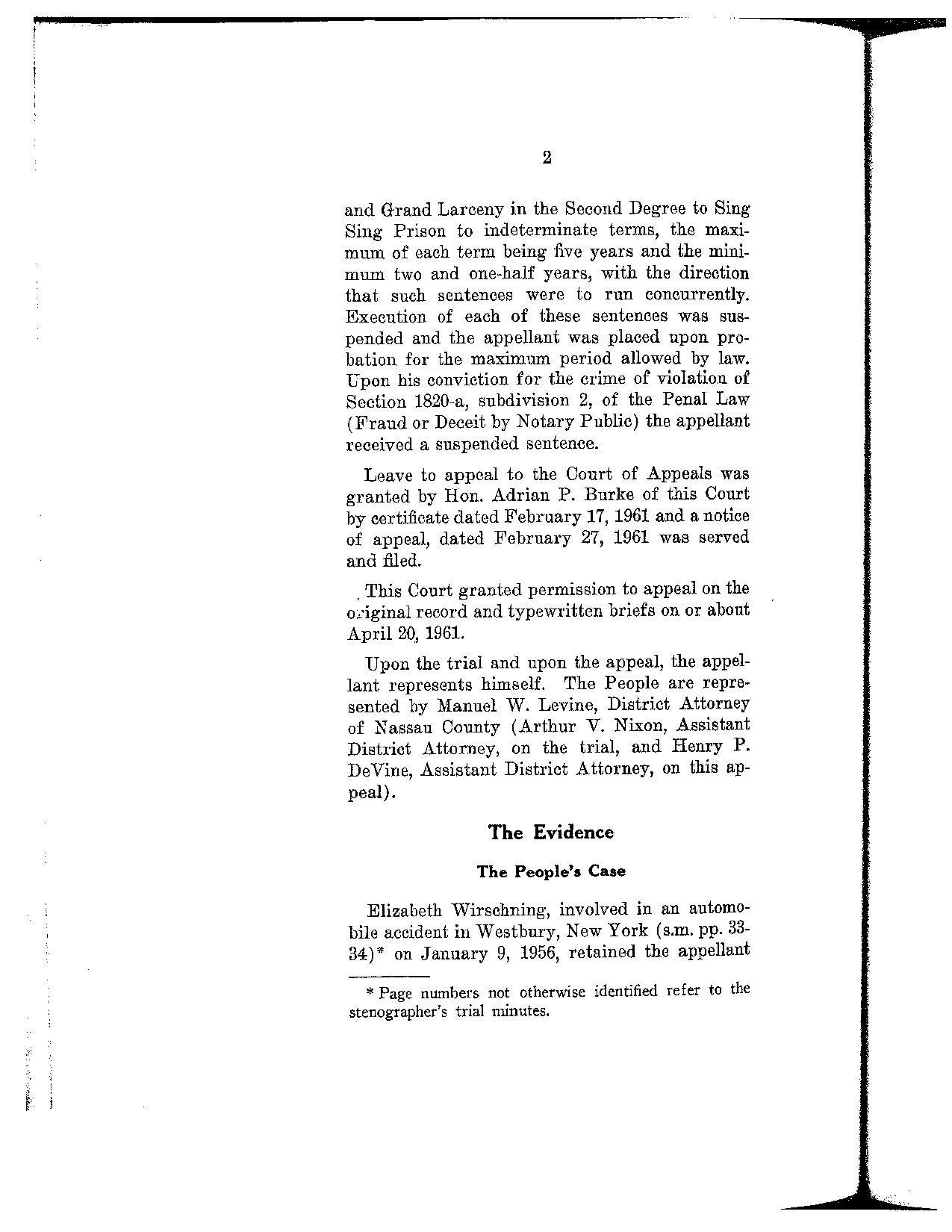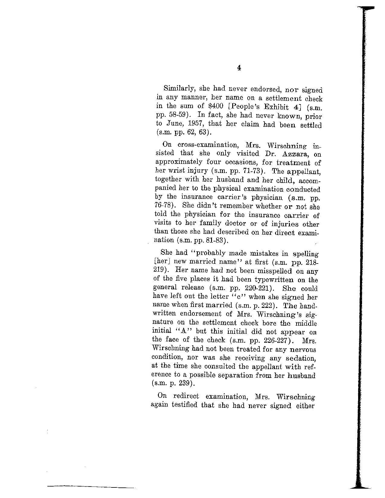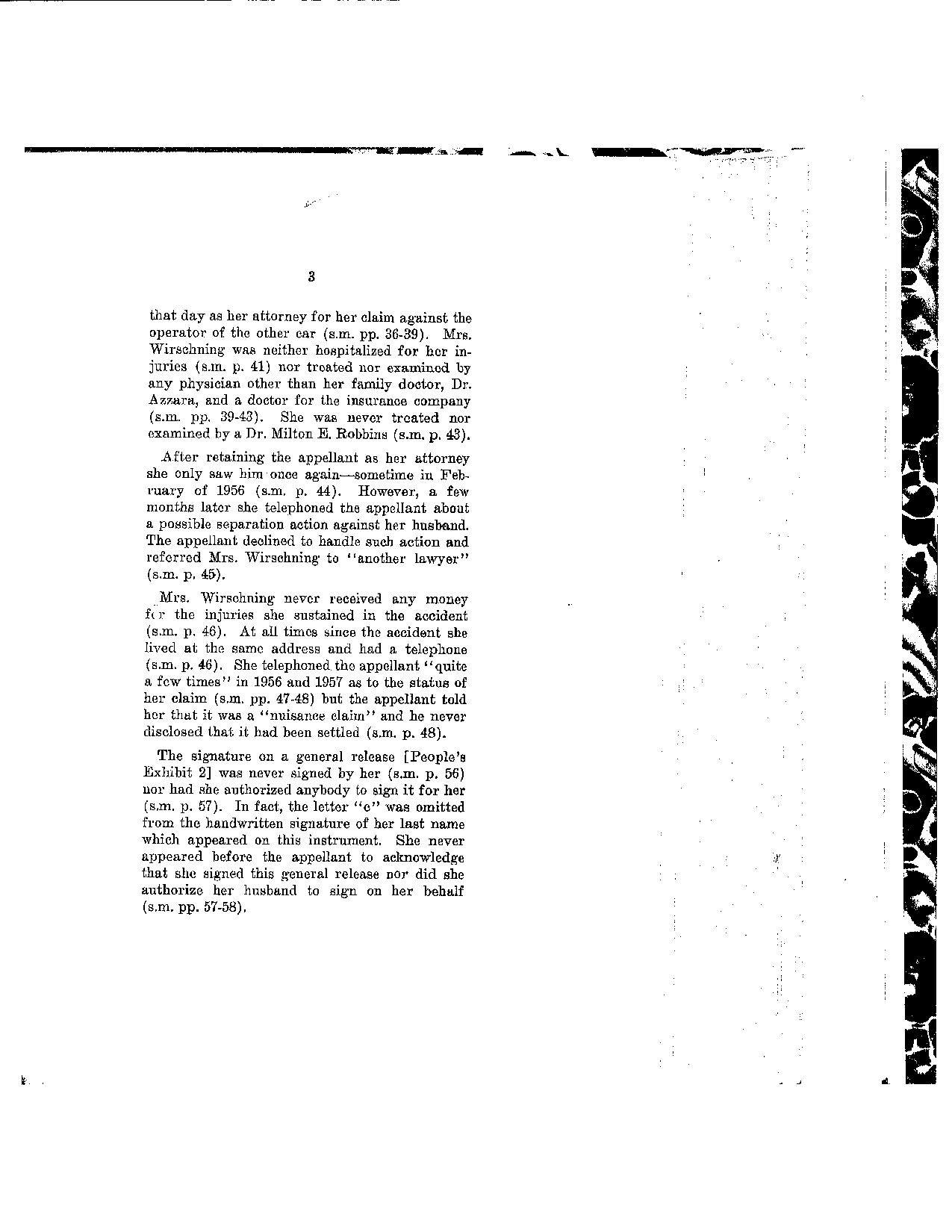 Attorney, on this appeal). Elizabeth Wirschning, involved in an automobile accident in Westbury, New York (s.m. pp. 33-34)* on January 9, 1956, retained the appellant that day for her claim against the operator of the other car (s.m. pp. 36-39). Mrs. Wirschning was neither hospitalized for her injuries (s.m. p. 41) nor treated nor examined by any physician other than her family doctor, Dr. Azzara, and a doctor for the insurance company (s.m. pp. 39-43). She was never treated nor examined by a Dr. Milton E. Robbins (s.m. p. 43). After retaining the appellant as her attorney she only saw him once again - sometime in February of 1956 (s.m. p. 44). However, a few months later she telephoned the appellant about a possible separation action against her husband. The appellant declined to handle such action and referred Mrs. Wirschning to "another lawyer" (s.m. p. 45). Mrs. Wirschning never recieved any money for the injuries she sustained in the accident (s.m. p. 46). At all times since the accident she lived at the same adress and had a telephone (s.m. p. 46). She telephoned the appellant "quite a few times" in 1956 and 1957 as to the status of her claim (s.m. pp. 47-48) but the appellant told her that it was a "nuisance claim" and he never disclosed that it had been settled (s.m. p. 48). The signature on a general release [People's Exhibit 2] was never signed by her (s.m. p. 56) nor had she authorized anybody to sign it for her (s.m. p. 57). In fact, the letter "c" was omitted from the handwritten signature of her last name which appeared on this instrument. She never appeared before the appellant to acknowledge that she signed this general release nor did she authorize her husband to sign on her behalf (s.m. pp. 57-58). Similarily, she had never endorsed, nor signed in any manner, her name on a settlement check in the sum of $400 [People's Exhibit 4] (s.m. pp. 58-59). In fact, she had never known, prior to June, 1957, that her claim had been settled (s.m. pp. 62, 63). On cross-examination, Mrs. Wirschning insisted that she only visited Dr. Azzara, on approximately four occasions, for treatment of her wrist injury (s.m. pp. 71-73). The appellant, together with her husband and her child, accompanied her to the physical examination conducted by the insurance carrier's physician (s.m. pp. 76-78). She didn't remember whether or not she told the physician for the insurance carrier of visits to her family doctor or of injuries other that those she had described on her direct examination (s.m. pp. 81-83). She had "probably made mistakes in spelling [her] new married name" at first (s.m. pp. 218-219). Her name had not been misspelled on any of the five places it had been typewritten on the general release (s.m. pp. 220-221). She could have left out the letter "c" when she signed her name when first married (s.m. p. 222). The hand-written endorsement of Mrs. Wirschning's signature on the settlement check bore the middle initial "A" but this initial did not appear on the face of the check (s.m. pp. 226-227). Mrs. Wirschning had not been treated for any nervous condition, nor was she recieving any sedation, at the time she consulted the appellant with reference to a possible separation from her husband (s.m. p. 239). On redirect