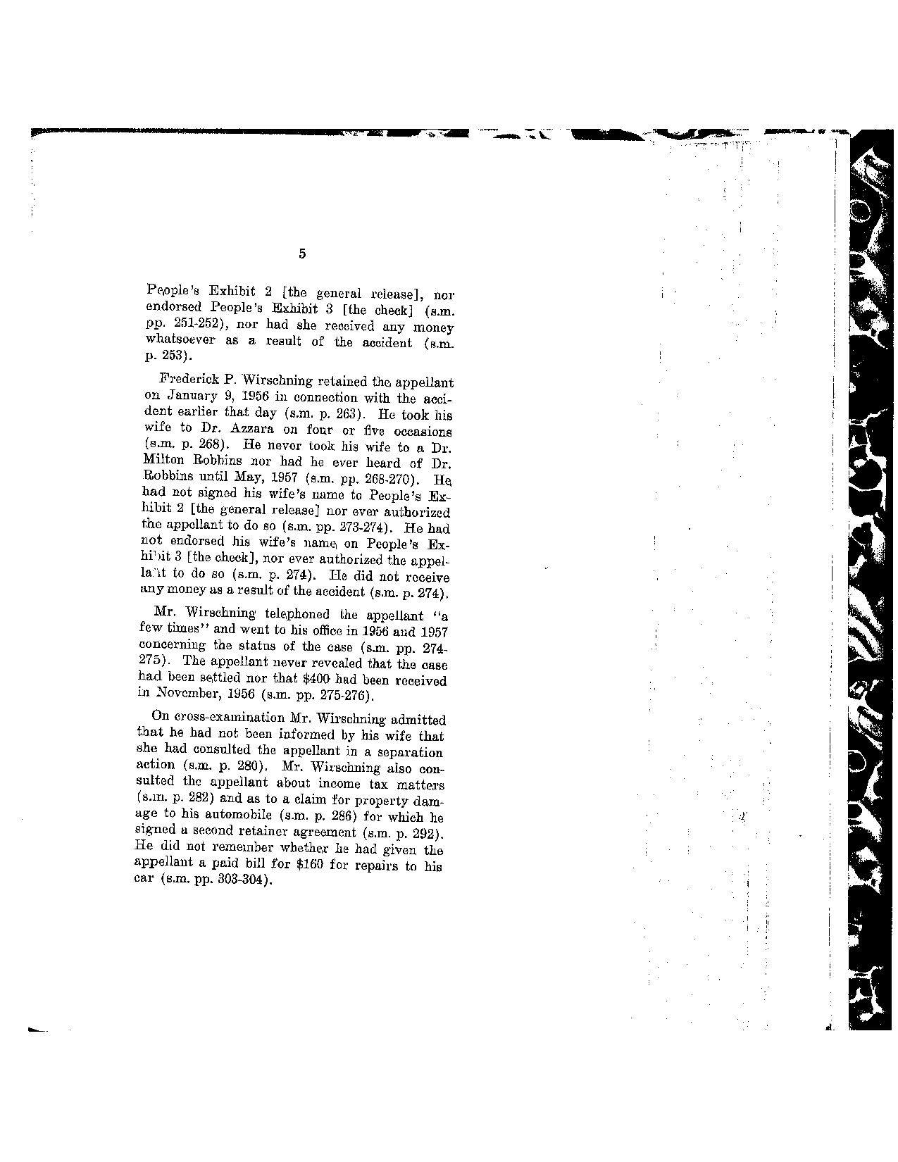 signed either People's Frederick P. Wirschning retained the appellant on January 9, 1956 in connection with the accident earlier that day (s.m. p. 263). He took his wife to Dr. Azzara on four or five occasions (s.m. p. 268). He never took his wife to a Dr. Milton Robbins nor had he ever heard of Dr. Robbins until May, 1957 (s.m. pp. 268-270). He had not signed his wife's name to People's Exhibit 2 [the general release] nor ever authorized the appellant to do so (s.m. pp. 273-274). He had not endorsed his wife's name on People's Exhibit 3 [the check], nor ever authorized the appellant to do so (s.m. p. 274). He did not recieve any money as a result of the accident (s.m. p. 274). Mr. Wirschning telephoned the appellant "a few times" and went to his office in 1956 and 1957 concerning the status of the case (s.m. pp. 274-275). The appellant never revealed that the case had been settled nor that $400 had been received in November, 1956 (s.m. pp. 275-276). On