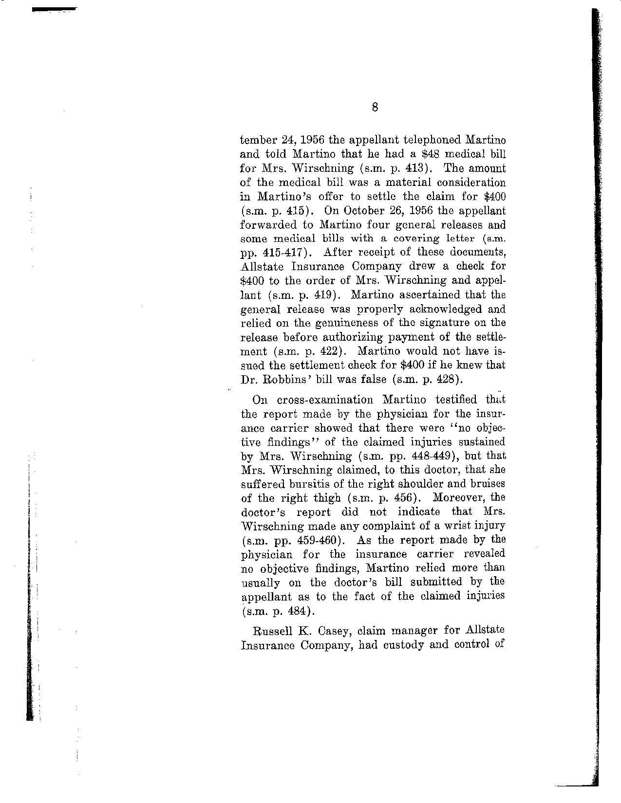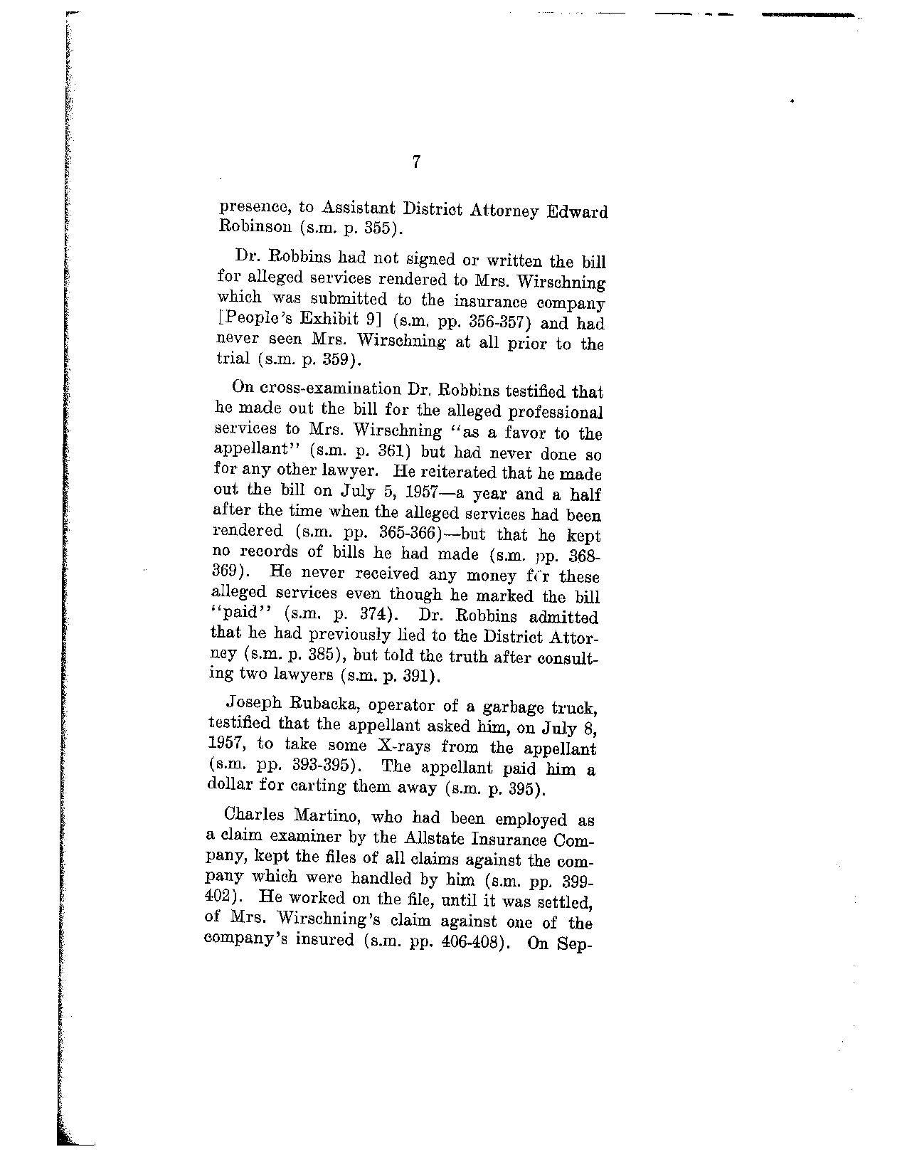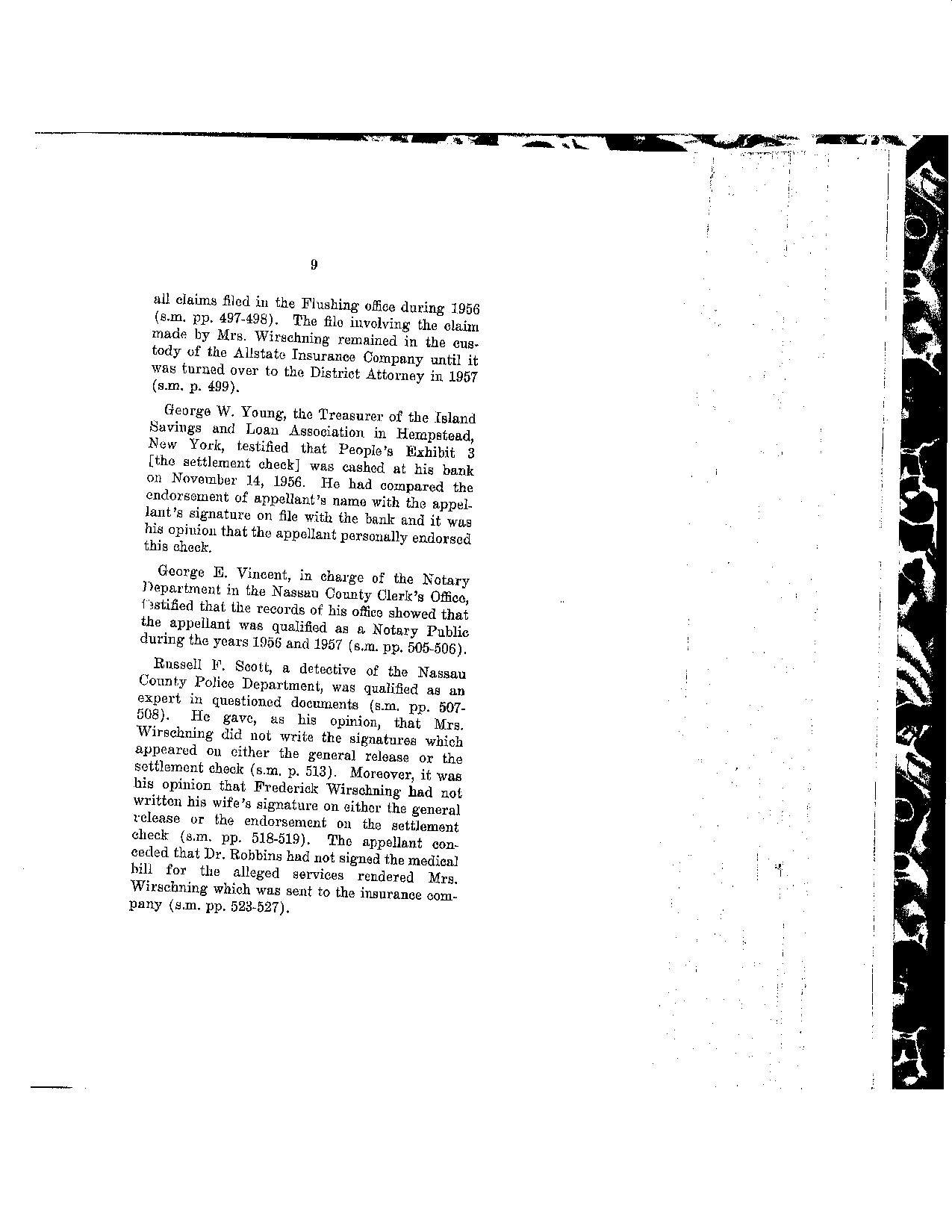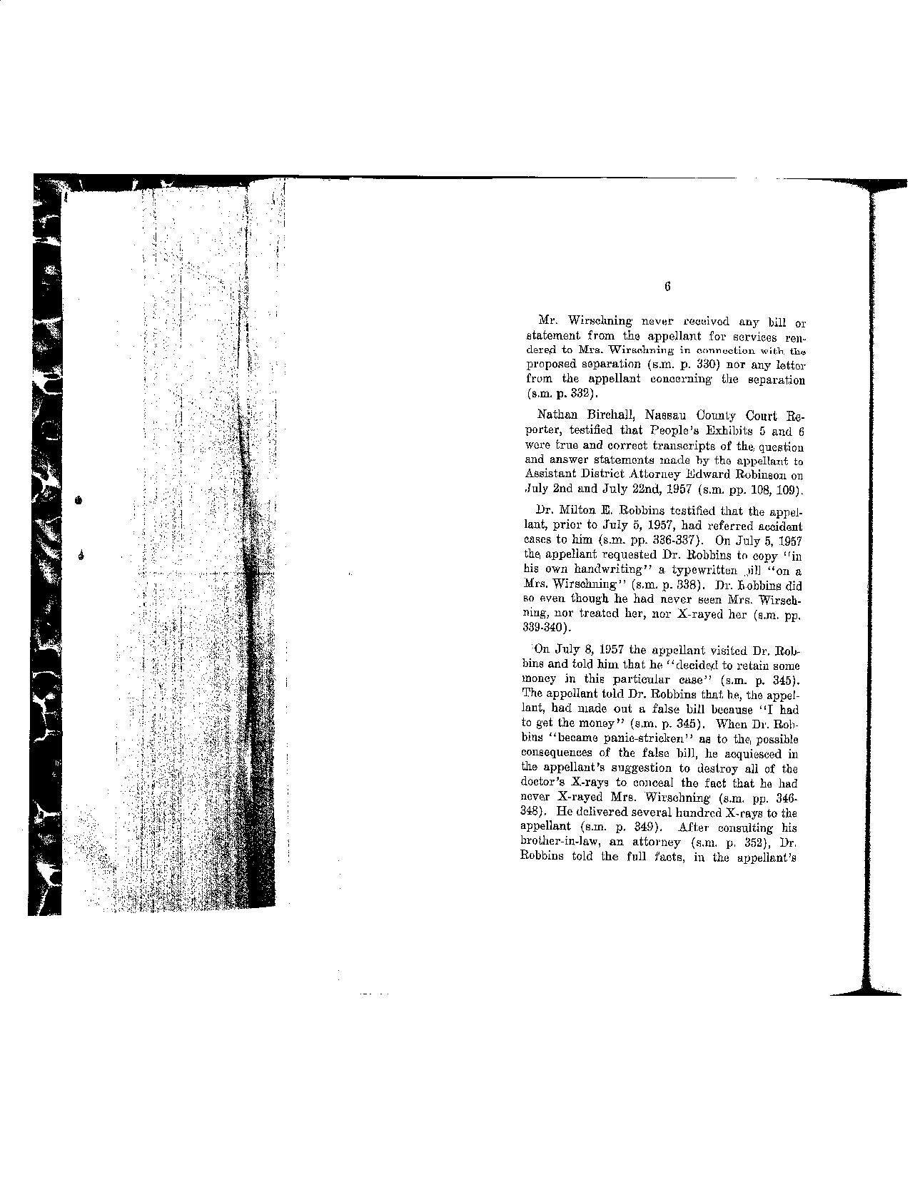 claim for property damage to his Mr. Wirschning never recieved any bill or statement from the appellant for services rendered to Mrs. Wirschning in connection with the proposed separation (s.m. p. 330) nor any letter from the appellant concerning the separation (s.m. p. 332) Nathan Birchall, Nassau County Court Reporter, testified that People's Exhibits 5 and 6 were true and correct transcripts of the question and answer statements made by the appellant to Assistant District Attorney Edward Robinson on July 2nd and July 22nd, 1957 (s.m. pp. 108, 109). Dr. Milton E. Robbins testified that the appellant, prior to July 5, 1957, had referred accident cases to him (s.m. pp. 336-337). On July 5, 1957 the appellant requested Dr. Robbins to copy "in his own handwriting" a typewritten bill "on a Mrs. Wirschning" (s.m. p. 338). Dr. Robbins did so even though he had never seen Mrs. Wirschning, nor treated her, nor X-rayed her (s.m. pp. 339-340). On July 8, 1957 the appellant visited Dr. Robbins and told him that he "decided to retain some money in this particular case" (s.m. p. 345). The appellant told Dr. Robbins that he, the appellant, had made out a false bill because "I had to get the money" (s.m. p. 345). When Dr. Robbins "became panic-stricken" as to the possible consequences of the false bill, he acquiesced in the appellant's suggestion to destroy all of the doctor's X-rays to conceal the fact that he had never X-rayed Mrs. Wirschning (s.m. pp. 346-348). He delivered several hundred X-rays to the appellant (s.m. p. 349). After consulting his brother-in-law, an attorney (s.m. p. 352), Dr. Robbins told the full facts, in the appellant's presence, to Assistant District Attorney Edward Robinson (s.m. p. 355). Dr. Robbins had not signed or written the bill for alleged services rendered to Mrs. Wirschning which was submitted to the insurance company [People's Exhibit 9] (s.m. pp. 356-357) and had never seen Mrs. Wirschning at all prior to the trial (s.m. p. 359). On cross-examination Dr. Robbins testified that he made out the bill for the alleged professional services to Mrs. Wirschning "as a favor to the appellant" (s.m. p. 361) but had never done so for any other lawyer. He reiterated that he made out the bill on July 5, 1957 - a year and a half after the time when the alleged services had been rendered (s.m. pp. 365-366) - but that he kept no records of bills he had made (s.m. pp. 368-369). He never recieved any money for these alleged services even though he marked the bill "paid" (s.m. p. 374). Dr. Robbins admitted that he had previously lied to the District Attorney (s.m. p 385), but told the truth after consulting two lawyers (s.m. p. 391). Joseph Rubacka, operator of a garbage truck, testified that the appellant asked him, on July 8, 1957, to take some X-rays from the appellant (s.m. pp. 393-395). The appellant paid him a dollar for carting them away (s.m. p. 395). Charles Martino, who had been employed as a claim examiner by the Allstate Insurance Company, kept the files of all claims against the company which were handled by him (s.m. pp. 399-402). He worked on the file, until it was settled, of Mrs. Wirschning's claim against one of the company's insured (s.m. pp. 406-408). On September 24, 1956 the appellant telephoned Martino and told Martino that he had a $48 medical bill for Mrs. Wirschning (s.m. p. 413). The amount of the medical bill was a material consideration in Martino's offer to settle the claim for $400 (s.m. p. 415). On October 26, 1956 the appellant forwarded to Martino four general releases and some medical bills with a covering letter (s.m. pp. 415-417). After reciept of these documents, Allstate Insurance Company drew a check for $400 to the order of Mrs. Wirschning and appellant (s.m. p. 419). Martino ascertained that the general release was properly acknowledged and relied on the genuineness of the signature on the release before authorizing payment of the settlement (s.m. p. 422). Martino would not have issued the settlement check for $400 if he knew that Dr. Robbin's bill was false (s.m. p. 428). On cross-examination Martino testified that the report made by the physician for the insurance carrier showed that there were "no objective findings" of the claimed injuries sustained by Mrs. Wirschning (s.m. pp. 448-449), but that Mrs. Wirschning claimed, to this doctor, that she suffered bursitis of the right shoulder and bruises of the right thigh (s.m. p. 456). Moreover, the doctor's report did not indicate that Mrs. Wirschning made any complaint of a wrist injury (s.m. pp. 459-460). As the report made by the physician for the insurance carrier revealed no objective findings, Martino relied more than usually on the doctor's bill submitted by the appellant as to the fact of the claimed injuries (s.m. p. 484). Russell K. Casey, claim manager for Allstate Insurance Company, had custody and control of all claims filed in the Flushing office during 1956 (s.m. pp. 497-498). The file involving the claim made by Mrs. Wirschning remained in the custody of the Allstate Insurance Company until it was turned over to the District Attorney in 1957 (s.m. p. 499). George W. Young, the Treasurer of the Island Savings and Loan Association in Hempstead, New York, testified that People's Exhibit 3 [the settlement check] was cashed at his bank on November 14, 1956. He had compared the endorsement of appellant's name with the appellant's signature on file with the bank and it was his opinion that the appellant personally endorsed this check. George E. Vincent, in charge of the Notary Department in the Nassau County Clerk's Office, testified that the records of his office showed that the appellant was qualified as a Notary Public during the years 1956 and 1957 (s.m. pp. 505-506). Russell F.