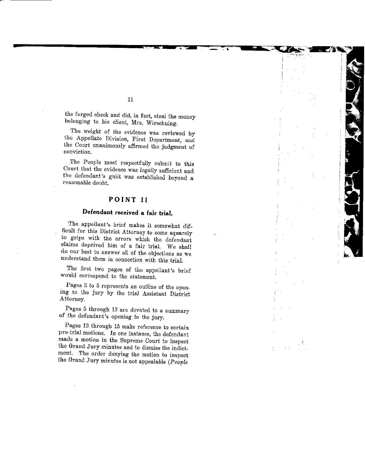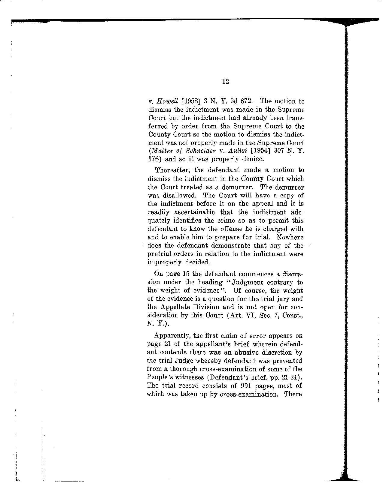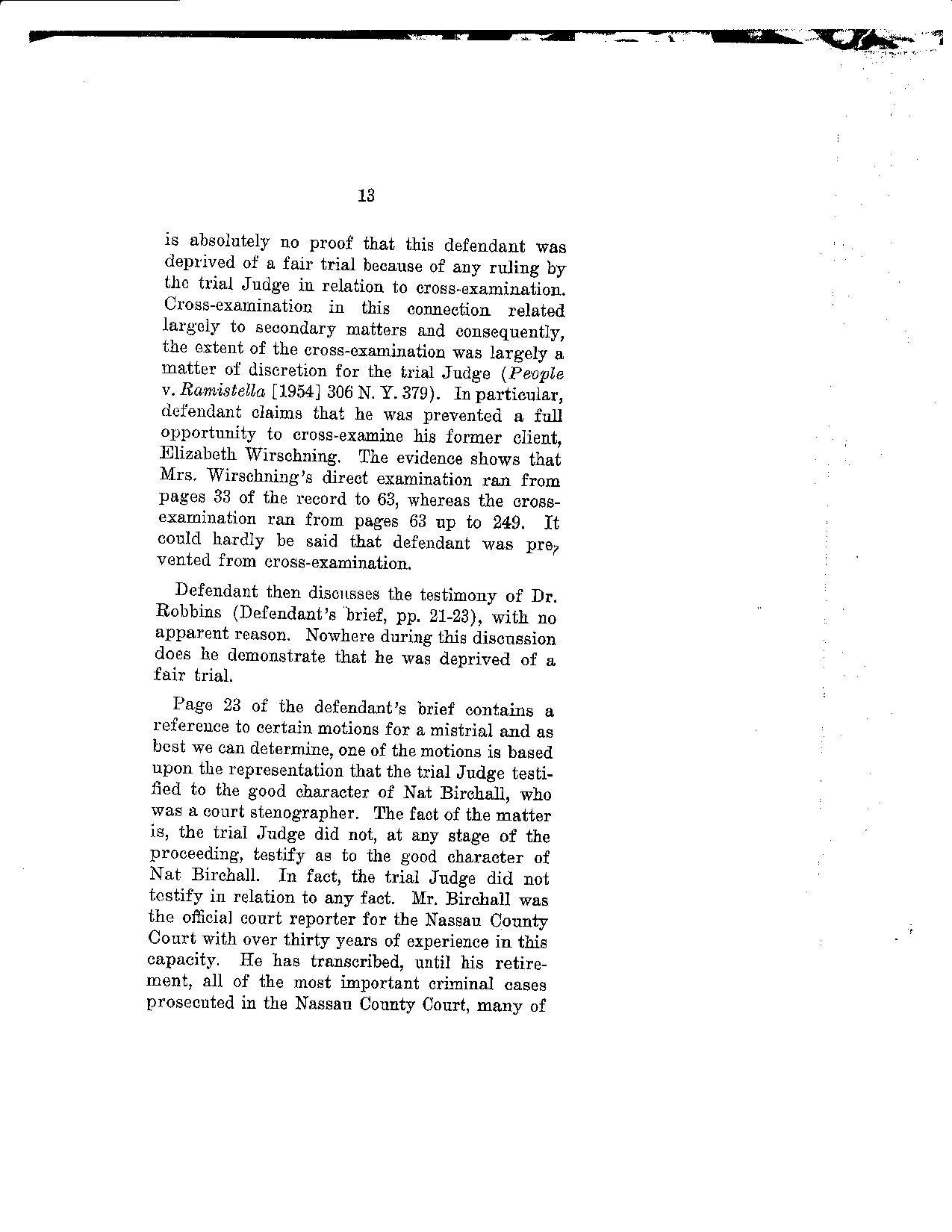 a reasonable doubt. The appellant’s brief makes it somewhat difficult for this District Attorney to come squarely to grips with the errors which the defendant claims deprived him of a fair trial. We shall do our best to answer all of the objections as we understand them in connection with this trial. The first two pages of the appellant’s brief would correspond to the statement. Pages 3 to 5 represents an outline of the opening to the jury by the trial Assistant District Attorney. Pages 5 through 13 are devoted to a summary of the defendant’s opening to the jury. Pages 13 through 15 make reference to certain pre-trial motions. In one instance, the defendant made a motion in the Supreme Court to inspect the Grand Jury minutes and to dismiss the indictment. The order denying the motion to inspect the Grand Jury minutes is not appealable. (People v. Howell [1958] 3 N.Y. 2d 672) The motion to dismiss the indictment was made in the Supreme Court but the indictment had already been transferred by order of the Supreme Court to the County Court so the motion to dismiss the indictment was not properly made in the Supreme Court (Matter of Scheider v.Aulisi [1954] 307 N.Y. 376) and so it was properly denied. Thereafter, the defendant made a motion to dismiss the indictment in the County Court which the Court treated as a demurrer. The demurrer was disallowed. The Court will have a copy of the indictment before it on the appeal and it is readily ascertainable that the indictment adequately identifies the crime so as to permit this defendant to know the offense he is charged with and to enable him to prepare for trial. Nowhere does the defendant demonstrate that any of the pretrial orders in relation to the indictment were improperly decided. On page 15 the defendant commences a discussion under the heading "Judgment contrary to the weight of evidence". Of course, the weight of evidence is a question for the trial jury and the Appellate Division and is not open for consideration by this Court. (Art. VI, Sec. 7, Const, N.Y.). Apparently, the first claim of error appears on page 21 if the appellant’s brief wherein defendant contends there was an abusive discretion by the trial Judge whereby defendant was prevented from a thorough cross-examination of some of the People’s witnesses (Defendant’s brief, pp. 21-24). The trial record consists of 991 pages, most of which was taken up by cross-examination. There is absolutely no proof that this defendant was deprived of a fair trial because of any ruling by the trial Judge in relation to cross-examination. Cross-examination in this connection related largely to secondary matters and consequently, the extent of the cross-examination was largely a matter of discretion for the trial Judge. (People v. Ramistella [1954] 306 N.Y. 379). In particular, the defendant claims that he was prevented a full opportunity to cross-examine his former client, Elizabeth Wirschning. The evidence shows that Mrs. Wirschning’s direct examination ran from pages 33 of the record to 63, whereas the cross-examination ran from pages 63 to 249. It could hardly be said that defendant was prevented from cross-examination. Defendant then discusses the testimony of Dr. Robbins (Defendant’s brief pp. 21-23), with no apparent reason. Nowhere during this discussion does he demonstrate the he was deprived of a fair trial. Page 23 of the defendant’s brief contains a reference to certain motions for a mistrial and as best we can determine, one of the motions is based upon the representation that the trial Judge testified to the good character of Nat Birchall, who was a court stenographer. The fact of the matter is, the trial Judge did not, at any stage of the proceeding, testify as to the good character of Nat Birchall. In fact, the trial Judge did not testify in relation to any fact. Mr. Birchall was the official court reporter for the Nassau County Court with over thirty years of experience in this capacity. He has transcribed, until his retirement, all of the most important criminal cases prosecuted in the Nassau County Court, many of which have been reviewed by this Court. The unwarranted and unsupported attack on the integrity and reputation of Mr. Birchall as revealed by this record was not justifiable. Defendant also claims that a motion for mistrial should have been granted because of an adjournment at the outset of the trial (Defendant’s brief, p.25). The record shows that the trial was adjourned from Thursday, November 6th until Wednesday November 12th (124-127). Other business of the Court made the Friday adjournment necessary and Tuesday was an official holiday, so the trial Judge decided, in his wisdom, to adjourn the case until Wednesday. The adjournment was at the discretion of the trial Judge and there is absolutely no showing that there was an abuse or that the adjournment deprived this defendant of a fair trial. Defendant once again turns his attack on Nat Birchall, the official court stenographer, and once again contends the Birchall’s stenographic notes should not have been received into evidence (Defendant’s brief, pp. 26-27). The substance of the defendant’s claim (Defendant’s brief, pp. 24-27) is that Nat Birchall forged or altered the transcript of the examination of the defendant conducted by the Assistant District Attorney, Edward Robinson. Birchall denied that he altered the minutes and there was absolutely not one scintilla of evidence to controvert this evidence except the unsupported and uncorroborated testimony of the defendant, himself. Birchall’s part in the case and in particular, the authenticity or correctness of the transcript of the Question and Answer statement of the defendant was, at best, a question of fact for the jury. The trial jury have resolved this question of fact against the defendant and he has failed to demonstrate that the trial jury were in error. The next claim of error is that Arthur Nixon, the trial Assistant Dis