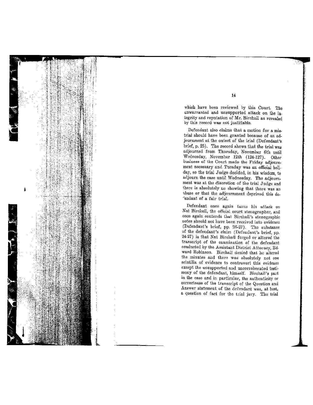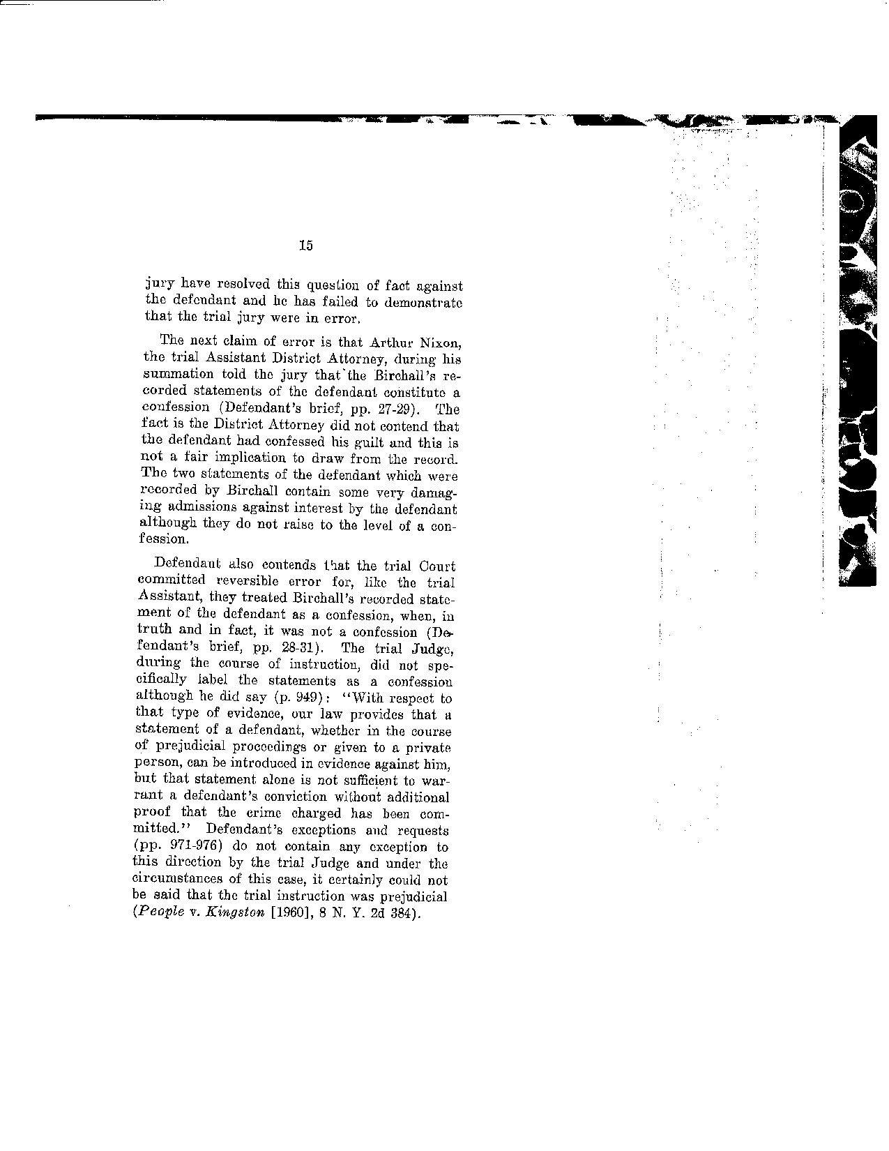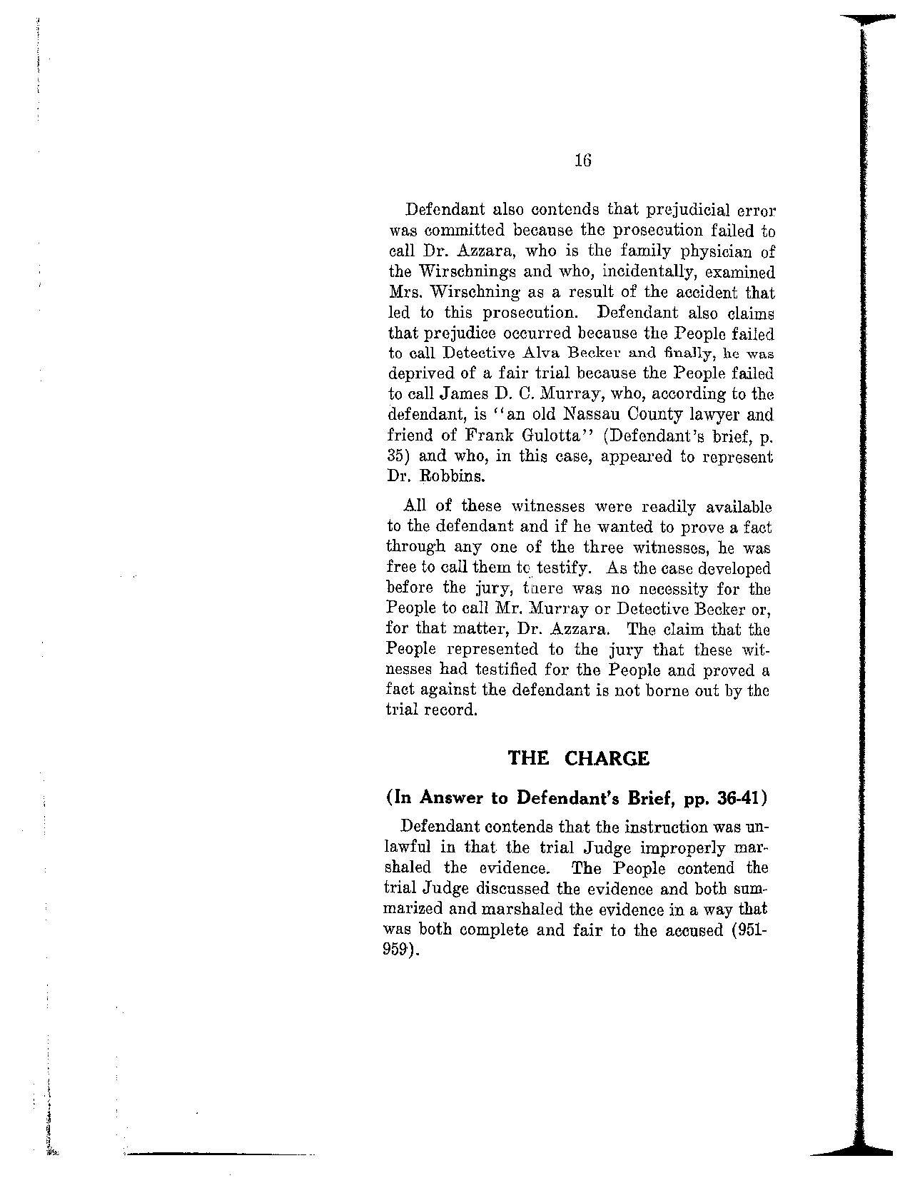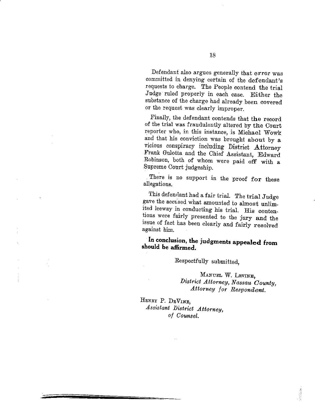a reasonable doubt. The appellant’s brief makes it somewhat difficult for this District Attorney to come squarely to grips with the errors which the defendant claims deprived him of a fair trial. We shall do our best to answer all of the objections as we understand them in connection with this trial. The first two pages of the appellant’s brief would correspond to the statement. Pages 3 to 5 represents an outline of the opening to the jury by the trial Assistant District Attorney. Pages 5 through 13 are devoted to a summary of the defendant’s opening to the jury. Pages 13 through 15 make reference to certain pre-trial motions. In one instance, the defendant made a motion in the Supreme Court to inspect the Grand Jury minutes and to dismiss the indictment. The order denying the motion to inspect the Grand Jury minutes is not appealable. (People v. Howell [1958] 3 N.Y. 2d 672) The motion to dismiss the indictment was made in the Supreme Court but the indictment had already been transferred by order of the Supreme Court to the County Court so the motion to dismiss the indictment was not properly made in the Supreme Court (Matter of Scheider v.Aulisi [1954] 307 N.Y. 376) and so it was properly denied. Thereafter, the defendant made a motion to dismiss the indictment in the County Court which the Court treated as a demurrer. The demurrer was disallowed. The Court will have a copy of the indictment before it on the appeal and it is readily ascertainable that the indictment adequately identifies the crime so as to permit this defendant to know the offense he is charged with and to enable him to prepare for trial. Nowhere does the defendant demonstrate that any of the pretrial orders in relation to the indictment were improperly decided. On page 15 the defendant commences a discussion under the heading "Judgment contrary to the weight of evidence". Of course, the weight of evidence is a question for the trial jury and the Appellate Division and is not open for consideration by this Court. (Art. VI, Sec. 7, Const, N.Y.). Apparently, the first claim of error appears on page 21 if the appellant’s brief wherein defendant contends there was an abusive discretion by the trial Judge whereby defendant was prevented from a thorough cross-examination of some of the People’s witnesses (Defendant’s brief, pp. 21-24). The trial record consists of 991 pages, most of which was taken up by cross-examination. There is absolutely no proof that this defendant was deprived of a fair trial because of any ruling by the trial Judge in relation to cross-examination. Cross-examination in this connection related largely to secondary matters and consequently, the extent of the cross-examination was largely a matter of discretion for the trial Judge. (People v. Ramistella [1954] 306 N.Y. 379). In particular, the defendant claims that he was prevented a full opportunity to cross-examine his former client, Elizabeth Wirschning. The evidence shows that Mrs. Wirschning’s direct examination ran from pages 33 of the record to 63, whereas the cross-examination ran from pages 63 to 249. It could hardly be said that defendant was prevented from cross-examination. Defendant then discusses the testimony of Dr. Robbins (Defendant’s brief pp. 21-23), with no apparent reason. Nowhere during this discussion does he demonstrate the he was deprived of a fair trial. Page 23 of the defendant’s brief contains a reference to certain motions for a mistrial and as best we can determine, one of the motions is based upon the representation that the trial Judge testified to the good character of Nat Birchall, who was a court stenographer. The fact of the matter is, the trial Judge did not, at any stage of the proceeding, testify as to the good character of Nat Birchall. In fact, the trial Judge did not testify in relation to any fact. Mr. Birchall was the official court reporter for the Nassau County Court with over thirty years of experience in this capacity. He has transcribed, until his retirement, all of the most important criminal cases prosecuted in the Nassau County Court, many of which have been reviewed by this Court. The unwarranted and unsupported attack on the integrity and reputation of Mr. Birchall as revealed by this record was not justifiable. Defendant also claims that a motion for mistrial should have been granted because of an adjournment at the outset of the trial (Defendant’s brief, p.25). The record shows that the trial was adjourned from Thursday, November 6th until Wednesday November 12th (124-127). Other business of the Court made the Friday adjournment necessary and Tuesday was an official holiday, so the trial Judge decided, in his wisdom, to adjourn the case until Wednesday. The adjournment was at the discretion of the trial Judge and there is absolutely no showing that there was an abuse or that the adjournment deprived this defendant of a fair trial. Defendant once again turns his attack on Nat Birchall, the official court stenographer, and once again contends the Birchall’s stenographic notes should not have been received into evidence (Defendant’s brief, pp. 26-27). The substance of the defendant’s claim (Defendant’s brief, pp. 24-27) is that Nat Birchall forged or altered the transcript of the examination of the defendant conducted by the Assistant District Attorney, Edward Robinson. Birchall denied that he altered the minutes and there was absolutely not one scintilla of evidence to controvert this evidence except the unsupported and uncorroborated testimony of the defendant, himself. Birchall’s part in the case and in particular, the authenticity or correctness of the transcript of the Question and Answer statement of the defendant was, at best, a question of fact for the jury. The trial jury have resolved this question of fact against the defendant and he has failed to demonstrate that the trial jury were in error. The next claim of error is that Arthur Nixon, the trial Assistant Dis