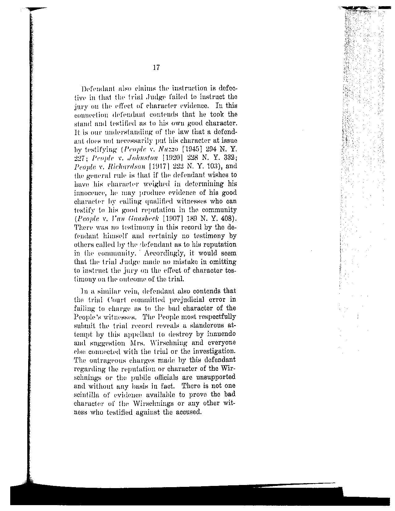 is not borne out by the trial record. The Charge Defendant contends that the instruction was unlawful in that the trial Judge improperly marshaled the evidence. The People contend the trial Judge discussed the evidence and both summarized and marshaled the evidence in a way that was both complete and fair to the accused (951-959). Defendant also claims the instruction is defective in that the trial Judge failed to instruct the jury on the effect of character evidence. In this connection the defendant contends that he took the stand and testified as to his own good character. It is our understanding of the law that a defendant does not necessarily put his character at issue by testifying (People v. Nuzzo [1945] 294 N.Y. 227; People v. Johnston [1920] 228 N.Y. 332; People v. Richardson [1917] 222 N.Y. 103), and the general rule is that if the defendant wishes to have his character weighed in determining his innocence, he may produce evidence of his good character by calling qualified witnesses who can testify to his good reputation in the community. There was no testimony in the record by the defendant himself and certainly no testimony by others called by the defendant as to his reputation in the community (People v. Van Gaasbeck[1907] 189 N.Y. 408). Accordingly, it would seem that the trial Judge made no mistake in omitting to instruct the jury in the effect of character testimony on the outcome of the trial. In a similar vein, defendant also contends that the trial Court committed prejudicial error in failing to charge as to the bad character of the People’s witnesses. The People most respectfully submit the trial record reveals a slanderous attempt by this appellant to destroy by innuendo and suggestion Mrs. Wirschning and everyone else connected with the trial or the investigation. The outrageous charges made by this defendant regarding the reputation or character of the Wirschnings or the public officials are unsupported and without any basis in fact. There is not one scintilla of evidence available to prove the bad character of the Wirschnings or any other witness who testified against the accused. Defendant also argues generally that error was committed in denying certain of the defendant’s requests to charge. The People contend the trial Judge ruled properly in each case. Either the substance of the charge had already been covered or the request was clearly improper. Finally, the defendant contends that the record of the trial was fraudulently altered by the Court reporter, who, in this instance, is Michael Wowk and that his conviction was brought about by a vicious conspiracy including District Attorney Frank Gulotta and the Chief Assistant, Edward Robinson, both of whom were paid off with a Supreme Court judgeship. There is no support in the proof for these allegations. This defendant had a fair trial. The trial Judge gave the accused what amounted to almost unlimited leeway in conducting his trial. His contentions were fairly presented to the jury and the issue of fact has been clearly and fairly resolved against him. In conclusion, the judgments appealed from should be affirmed.