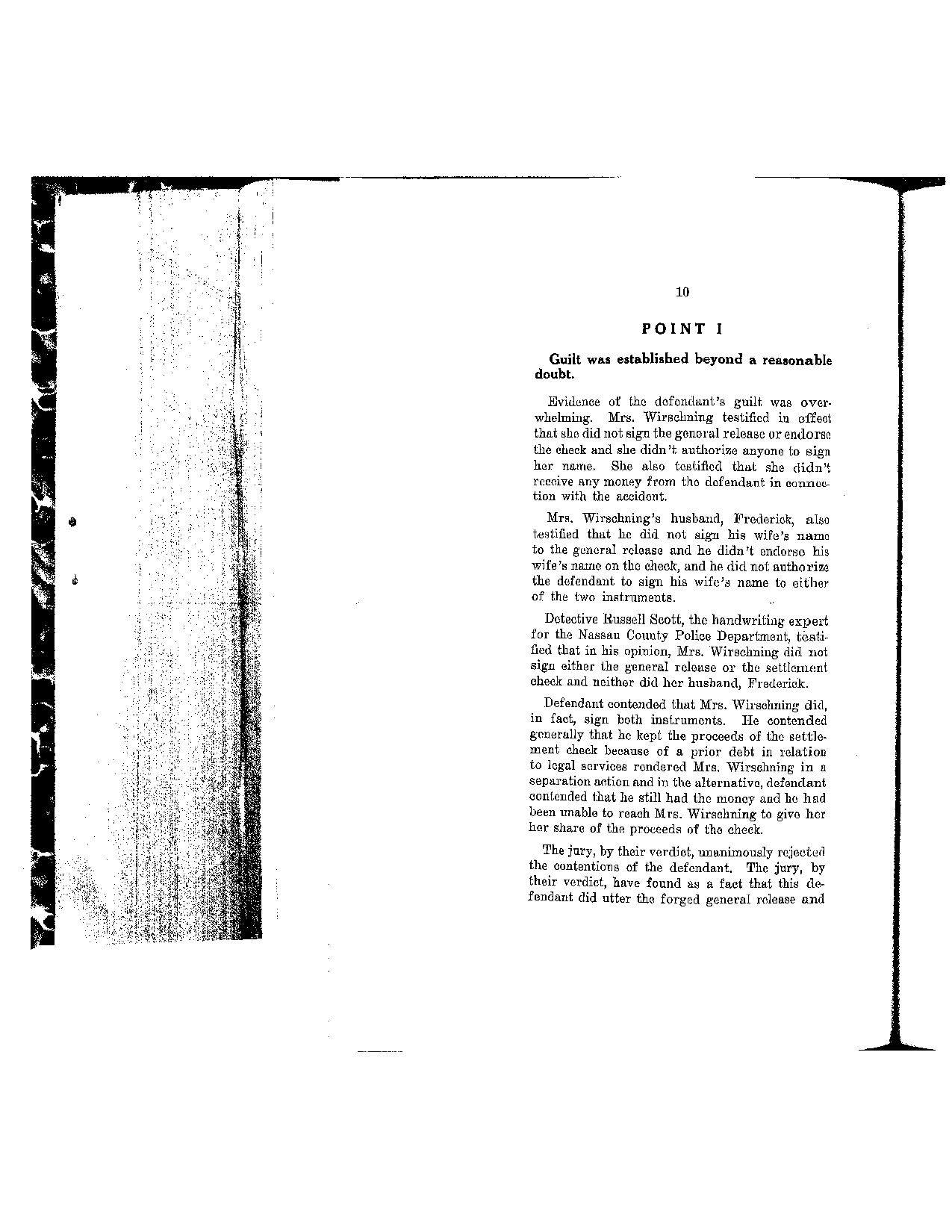 523-527). Point I Evidence of the defendant’s guilt was overwhelming. Mrs. Wirschning testified in effect that she did not sign the general release or endorse the check and didn’t authorize anyone to sign her name. She also testified that she didn’t receive any money from the defendant in connection with the accident. Mrs. Wirschning’s husband, Frederick, also testified that he did not sign his wife’s name to the general release and he didn’t endorse his wife’s name on the check, and he did not authorize the defendant to sign his wife’s name to either of the two instruments. Detective Russell Scott, the handwriting expert for the Nassau County Police Department, testified that in his opinion, Mrs. Wirschning did not sign either the general release or the settlement check and neither did her husband, Frederick. Defendant contended that Mrs. Wirschning did, in fact, sign both instruments. He contended generally that he kept the proceeds of the settlement check because of a prior debt in relation to legal services rendered Mrs. Wirschning in a separation action and in the alternative, defendant contended that he still had the money and he had been unable to reach Mrs. Wirschning to give her her share of the proceeds of the check. The jury, by their verdict, unanimously rejected the contentions of the defendant. The jury, by their verdict, have found as a fact that this defendant did utter the forged general release and the forged check and did, in fact, steal the money belonging to his client, Mrs. Wirschning. The weight of the evidence was reviewed by the Appellate Division, First Department, and the Court unanimously affirmed the judgment of conviction. The People